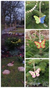 Im Anschluss schmückten die Eltern gemeinsam den Weihnachtsbaum auf der Ruhestätte mit ihren persönlichen Holzschmetterlingen. Die selbst gestalteten Kerzen nahmen sie mit nach Hause. Als Zeichen der Verbundenheit brannten diese Kerzen zum weltweiten Gedenktag für verstorbene Kinder in den Fenstern der Häuser.